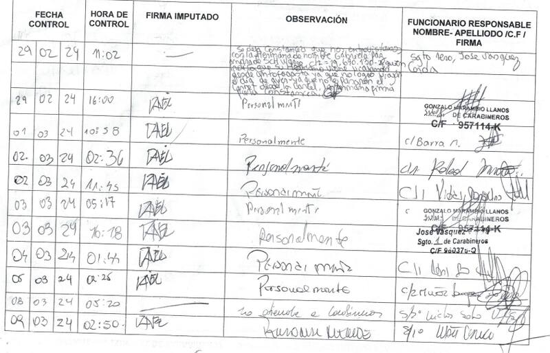 “A sus antecedentes oficio N° 1700 de la 61° Comisaría de Carabineros, Cabo 2° Pablo Silva Pizarro, el cual indica que el imputado Daniel Francisco Andrade Schwarze no ha dado cumplimiento a la medida cautelar de arresto domiciliario total, durante el período que se indica, téngase presente. Póngase en conocimiento del Ministerio Público para los fines que correspondan”, informó la jueza Claudia Campusano.