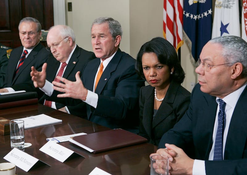 Además, ha sido denominado uno de los arquitectos de la guerra de Irak, conflicto bélico que fue calificado por él mismo luego como una “mancha en su legado”, debido a las múltiples críticas que recibió tras un recordado discurso de 75 minutos ante Naciones Unidas en el que aseguró que había presencia de armas de destrucción masiva en poder de Irak, información incorrecta y motivo por el cual no siguió en el cargo tras la reelección de Bush.