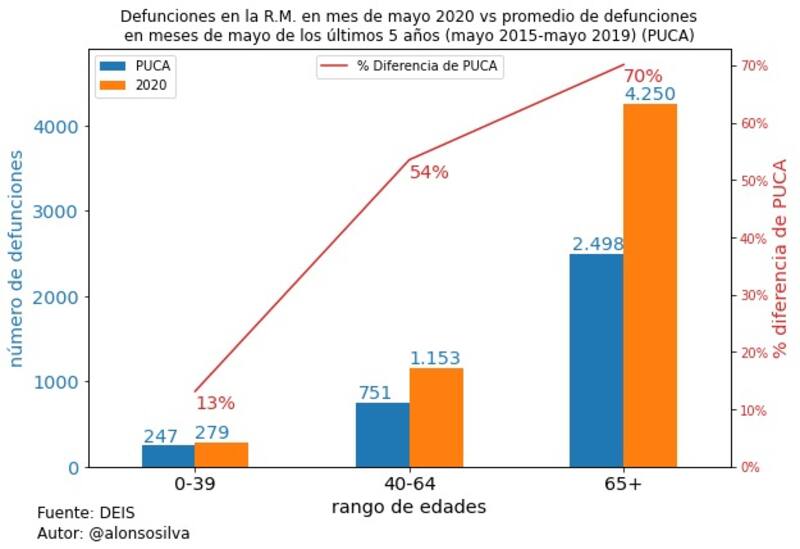En otro análisis, esta vez a partir de la cifra de defunciones totales durante mayo entregada por el DEIS, Alonso SIlva, investigador chileno en Safran Tech, encontró que los principales aumentos en decesos por grupo etáreo en la Región Metropolitana comparando mayo de 2020 con los cinco años previos se producían entre los mayores de 65 años. Para ese grupo, el incremento de fallecidos es de 70%, contra 54% para el bloque que va entre 40 y 64 años y 13% para los menores de 40 años.