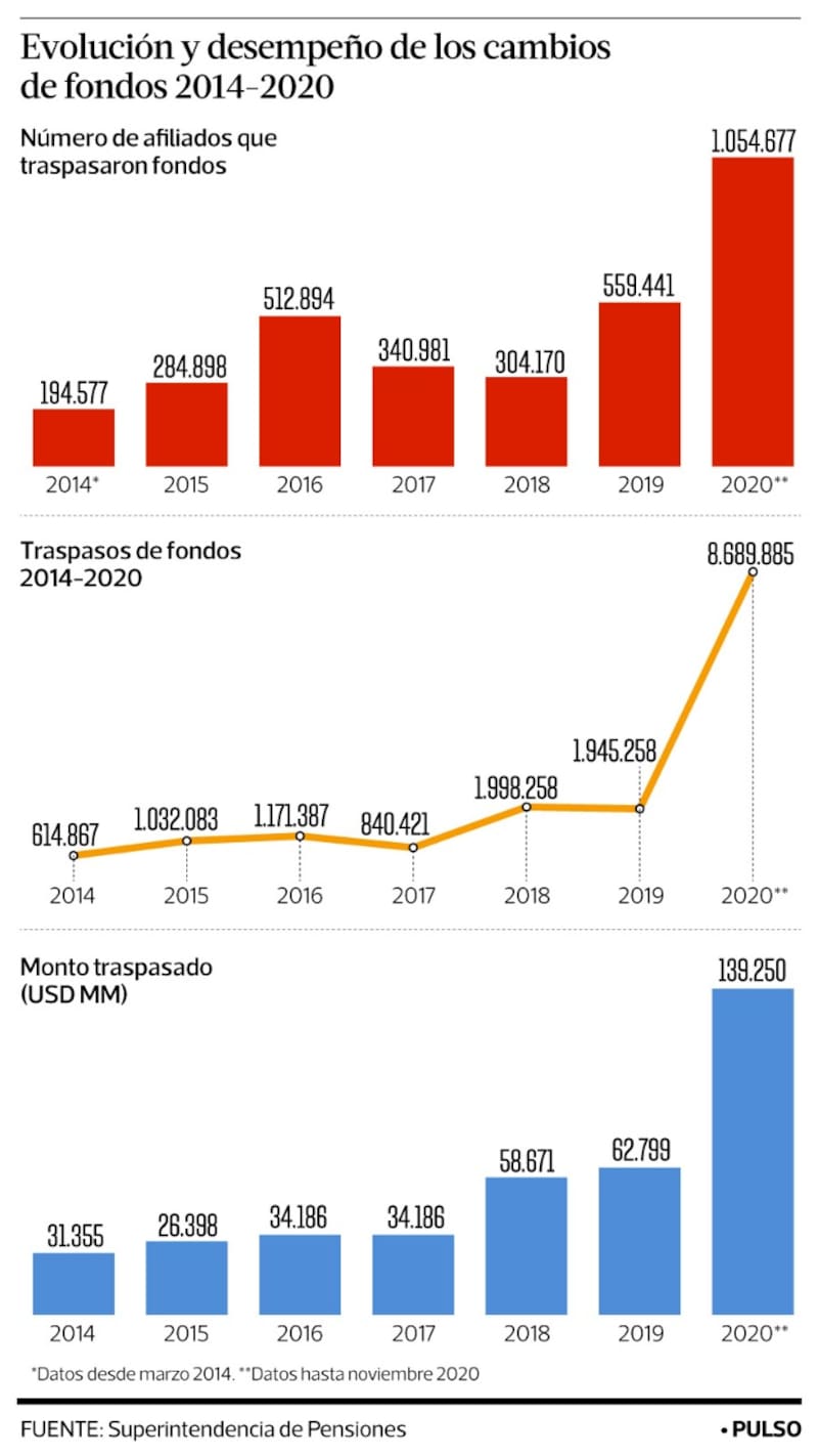 Además, se trata de la mayor variación anual en la cantidad de traspasos, que pasaron de 1.945.258 durante 2019 a un total de 8.689.885 en 2020, lo que configura un alza de 347%. Por otro lado, el incremento también se aprecia en los montos transados en los cambios de fondos: si en 2019 el total alcanzó US$62.799 millones, en 2020 estos llegaron a US$139.250 millones, con un alza del 122%.