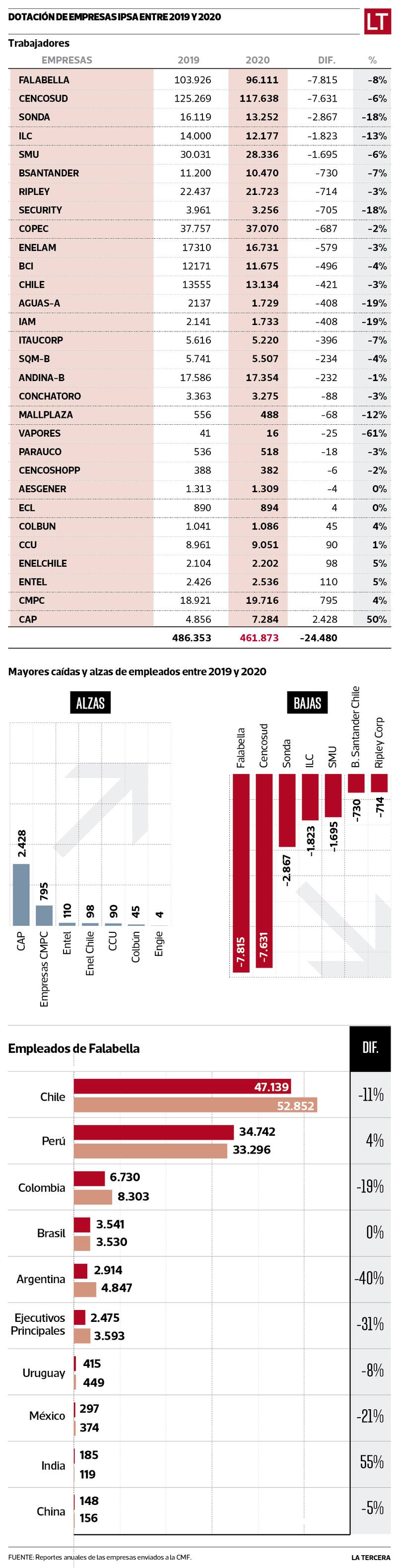 Las compañías que más disminuyeron sus empleos fueron Falabella (-7.815); Cencosud (-7.631); Sonda (-2.867); ILC (-1.823); SMU (-1.695); Banco Santander Chile (-730) y Ripley Corp (-714). Mientras que sólo siete firmas elevaron sus dotaciones en 2020 en comparación con 2019. Se trata de CAP (2.428); Empresas CMPC (795); Entel (110); Enel Chile (98); CCU (90); Colbún (45) y Engie (4).