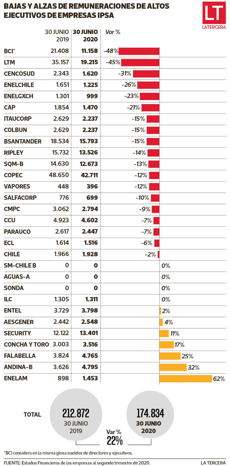 El listado de las compañías que más han reducido los sueldos a los cargos de alta gerencia es liderado por LATAM Airlines -compañía controlada por la familia Cueto- que en medio de la pandemia debió acogerse al Capítulo 11 de la Ley de Quiebras de Estados Unidos e inició en marzo una disminución del 30% de su operación de pasajeros debido al cierre de fronteras a nivel global. Entre el 30 de junio de 2020 e igual mes del año anterior, las remuneraciones de la sociedad, considerando los niveles ejecutivos, disminuyeron 45%, según expuso en su último reporte financiero.