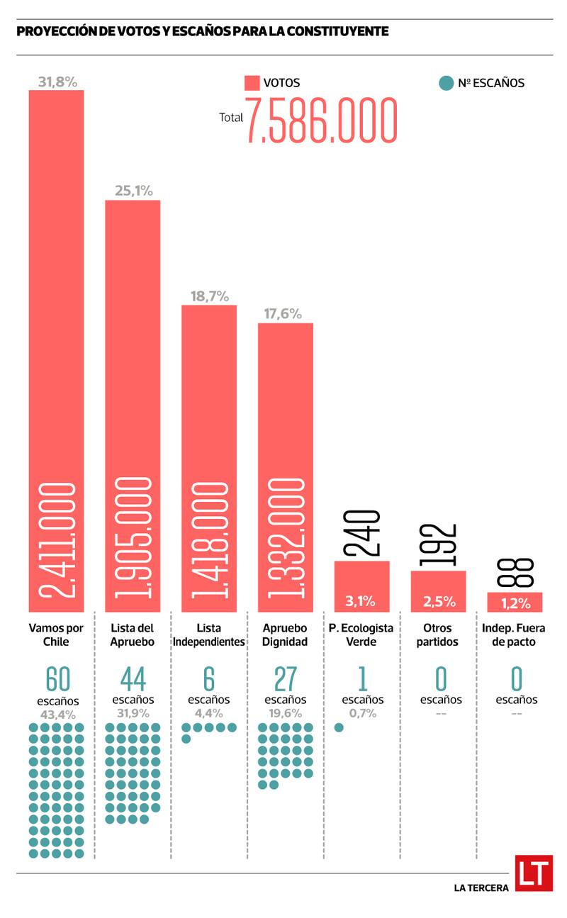 El hecho de que la coalición oficialista haya alcanzado un acuerdo unitario e inscribiera una sola nómina que agrupa a la UDI, RN, Evópoli, el PRI y al Partido Republicano, según la proyección, le permitiría obtener un 43,4% de la convención, es decir, 60 escaños. En el caso de la oposición, la lista por el Apruebo -representada por la Unidad Constituyente (PS, PPD, DC, PR, PRO y Ciudadanos)- obtendría la mayoría de escaños del sector, llegando a un 31,9% (equivalentes 44 cupos). Apruebo Dignidad -PC, Frente Regionalista Verde Social, RD, Convergencia Social, Comunes, Igualdad y Acción Humanista- alcanzaría 27 convencionales (19,6%). El Partido Ecologista Verde, en tanto, lograría sólo un 0,7% de la convención constitucional, equivalentes a solo un escaño.