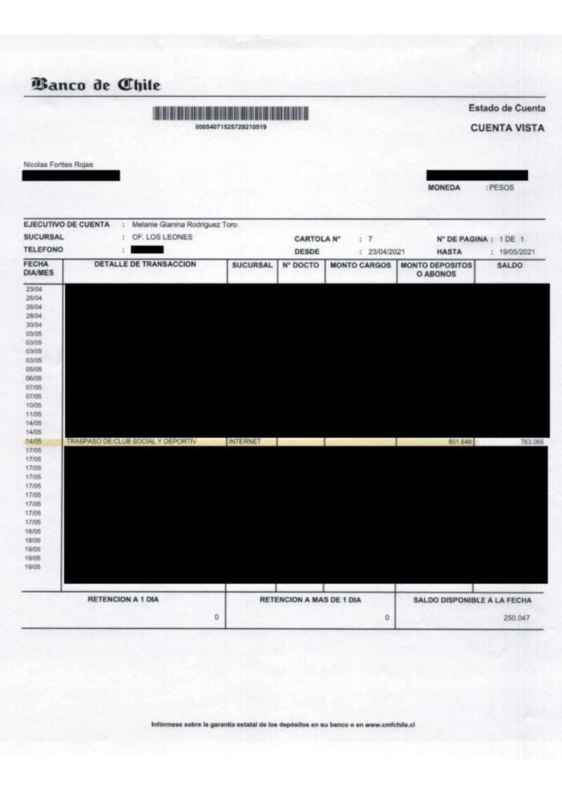 Durante esta mañana, además, AS Chile publicó otras denuncias que vinculan a Forttes. Según indica el medio, el jugador recibió transferencias desde una cuenta corriente de Paula Viviana Medel Torres, persona que no guarda ninguna relación con el club Melipilla, pero que es quien le habría cancelado en negro 500 mil pesos mensuales. Así lo establecen las cartolas de cuenta corriente del futbolista que están en la carpeta de investigación de la ANFP.