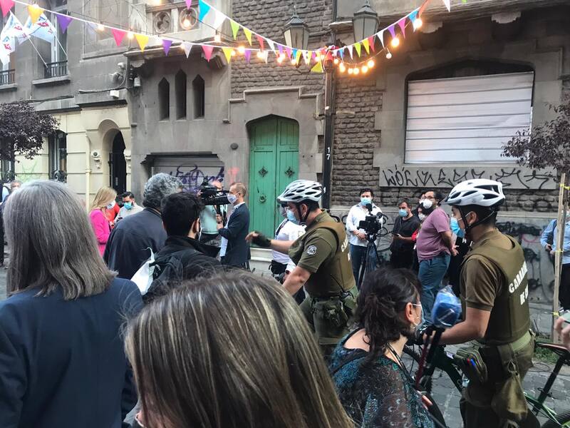 Dos carabineros en bicicleta llegaron ayer a las afueras de la sede del Partido Socialista, en la calle París, para fiscalizar a los organizadores del evento con que, horas más tarde, la Unidad Constituyente celebraría el triunfo del Apruebo.