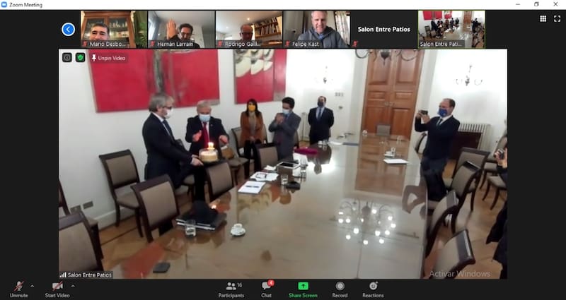 A la reunión llegó Mañalich, que el día anterior había estado de cumpleaños. Lo recibieron con una torta y Monckeberg retrató el momento con su celular desde el otro lado de la mesa. En Desarrollo Social dicen que otras reuniones las hace por zoom y él mismo dijo hoy en Chilevisión que "hemos tenido reuniones con protocolo exhaustivo, de más de dos metros de distancia, con mascarilla, reuniones cortas, la mayoría por Zoom”.