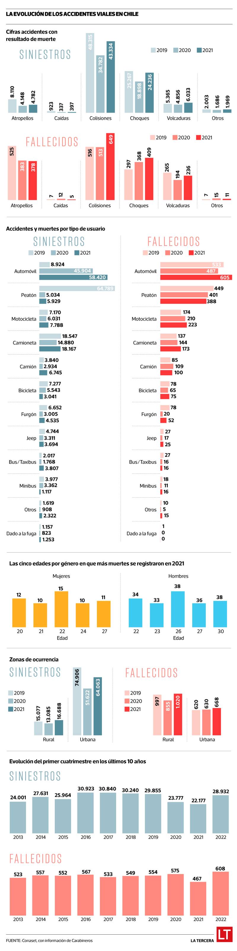 Esta historia es solo una de las cientos que este año enlutan las vías y carreteras de Chile. Y es que, según cifras de Carabineros, este cuatrimestre (enero-abril) es el que más fallecimientos registra de los últimos 10 años, con 608. El fallecimiento de este grupo familiar y el conductor del taxi, todos vecinos del sector de Ibacache, no están incluidos en este triste índice, pero duelen y preocupan: si todo sigue igual, 2022 será el año con más muertes en las vías desde que hay registro.