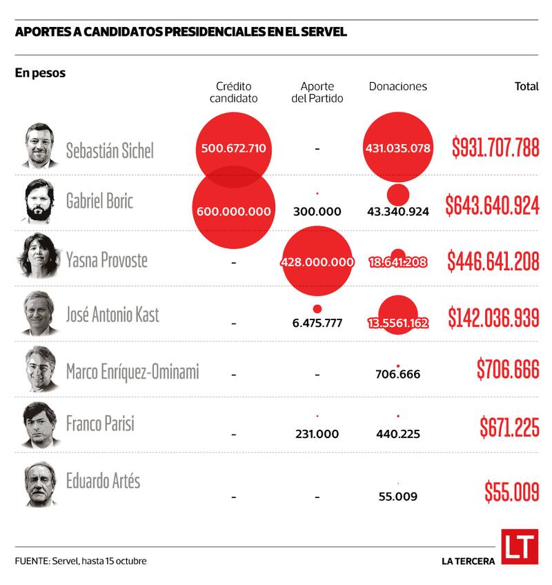 Ello no necesariamente significa que sea quien cuenta con los montos más altos de aportes, ya que ese trono en forma indiscutida lo ostenta el candidato de Chile Podemos Más, Sebastián Sichel, con un total de $ 931 millones. Ese monto representa el 43% de un total de $ 2.165 millones recibidos, de parte de personas particulares o partidos, en el Servel para financiar las campañas políticas para la Presidencia de la República. Cabe recordar que este viernes 22 de octubre comienza la propaganda oficial en lugares públicos o privados mediante carteles y palomas, así como se empieza a transmitir la franja televisiva.