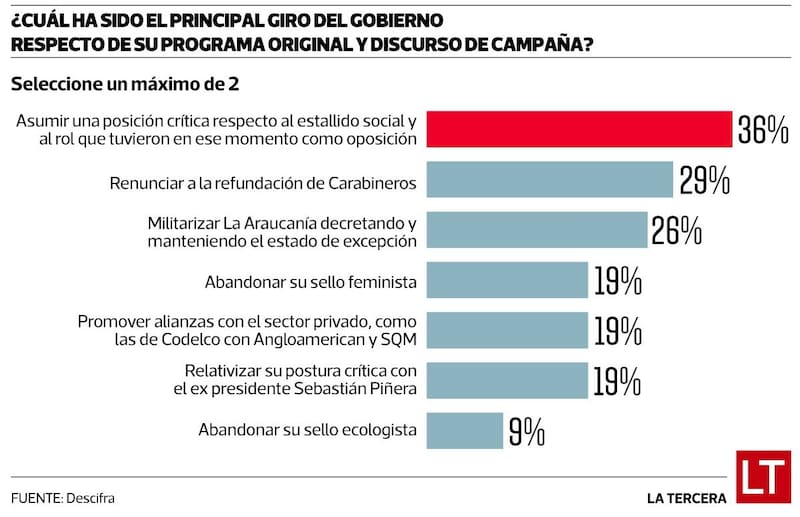 El 36% de los entrevistados en la última encuesta Descifra -una alianza entre Artool y Copesa- dieron el primer lugar al cambio de opinión del Presidente sobre los hechos ocurridos en octubre de 2019. Le siguieron el haber renunciado a la refundación de Carabineros y, en tercer lugar, decretar estado de excepción en la Araucanía.