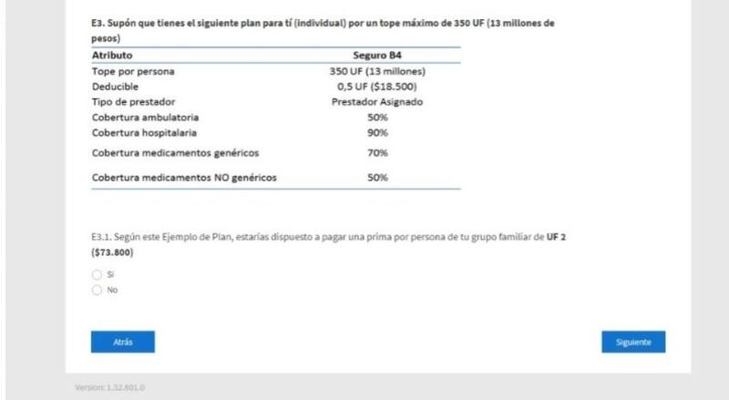 Aunque aún es un escenario ficticio y con un futuro incierto, el cuestionario parte explicando que “el límite anual de cobertura sería fijado en UF 350 (alrededor de 13 millones de pesos) por cada miembro de tu grupo familiar asegurado”.