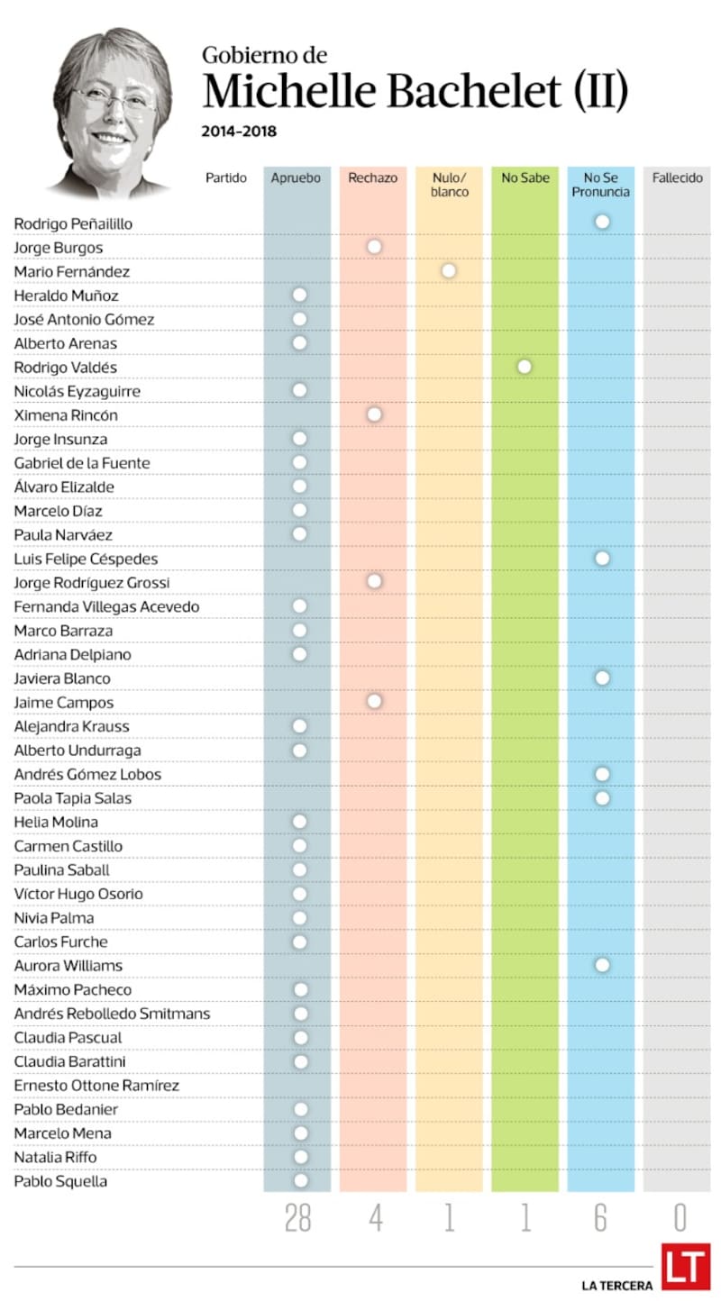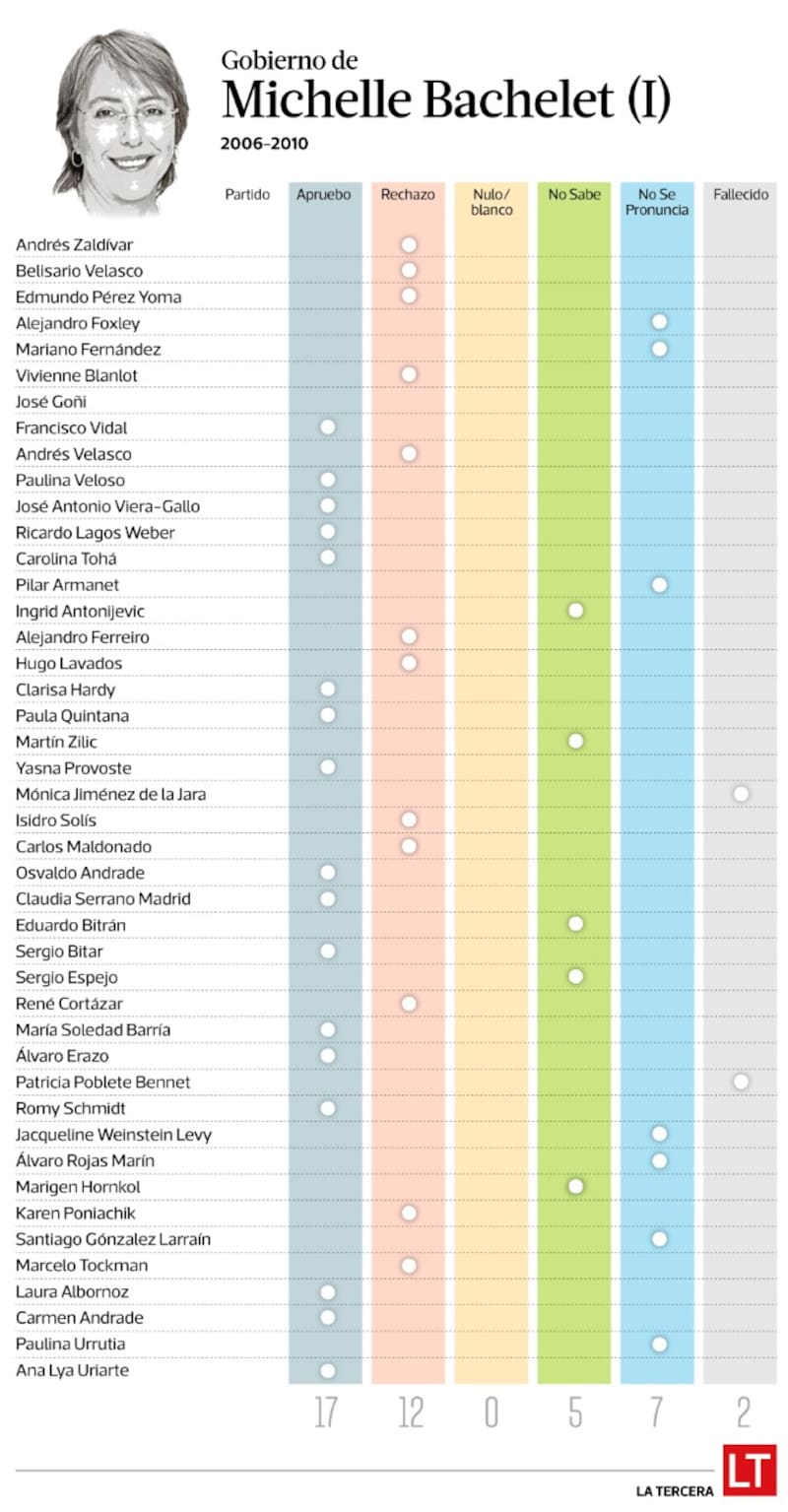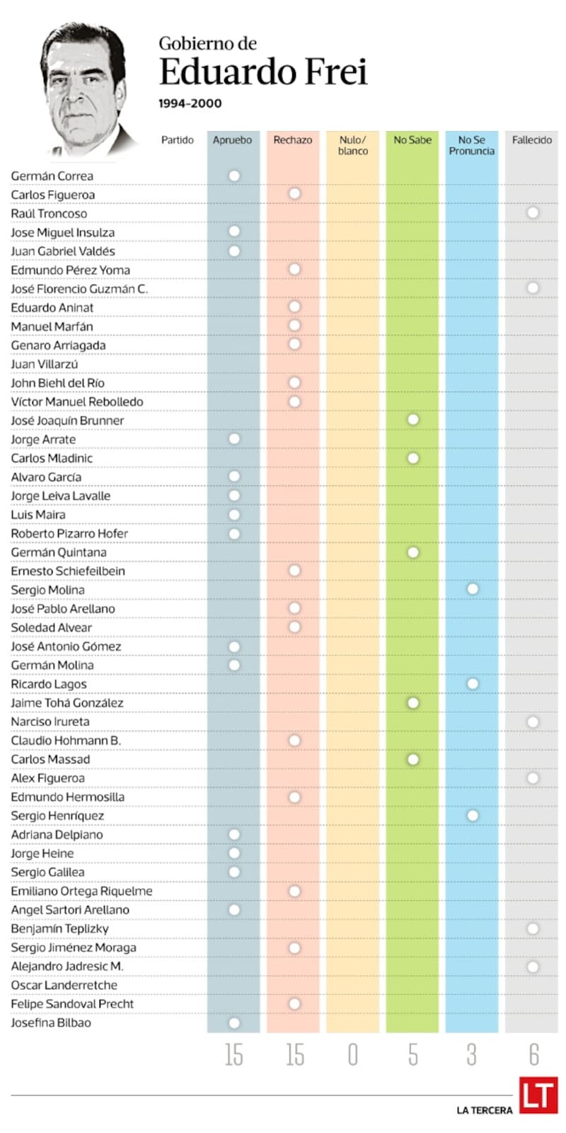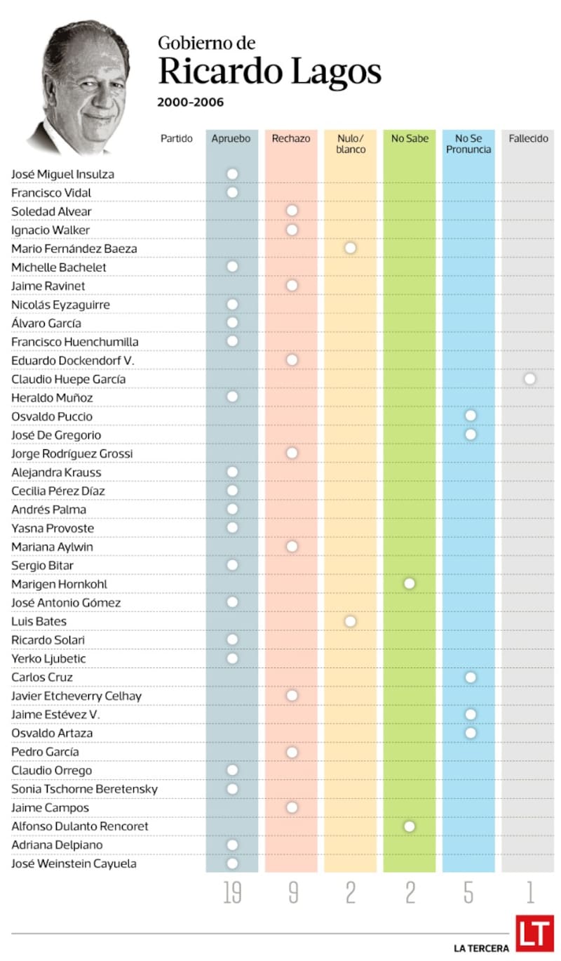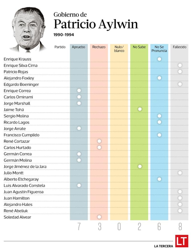 Mientras, del gabinete que se instaló en el poder en marzo de 1990 de la mano del presidente Patricio Aylwin, 7 ya decidieron su voto por el Apruebo y 3 se han decantado directamente por el Rechazo, en el caso de los gabinetes de Frei Ruiz Tagle, ambas opciones prácticamente se encuentran en un empate técnico, con 15 personeros a favor del Apruebo y 15 a favor del Rechazo.
