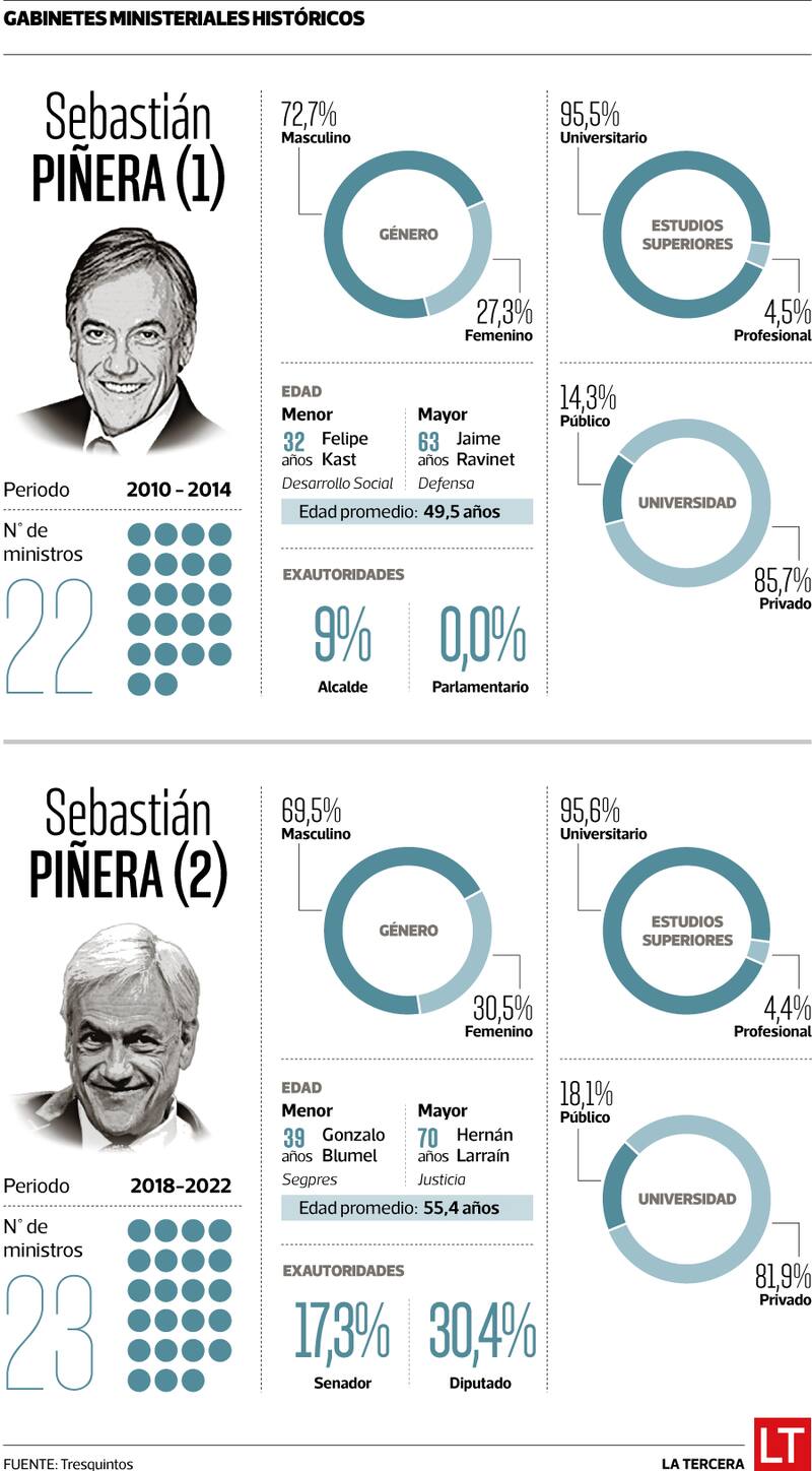 La tendencia, sin embargo, cambió con la primera llegada del Presidente Piñera. Su gabinete se conformó por profesionales que, en un 85,7% provenían de aulas privadas y un 41,3%, de salas públicas. En su segundo mandato, en tanto, el 81,9% había cursado sus estudios en instituciones privadas y un 18,1% en públicas.
