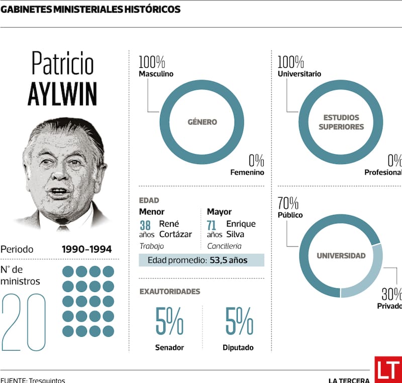 En el gobierno de Patricio Aylwin, un 70% de los ministros provenía de casas de estudios estatales y el otro 30% de universidades privadas. En el caso de Eduardo Frei, los ministros que estudiaron en aulas públicas llegaron a un 85%, mientras que un 15% lo hizo en privadas.
