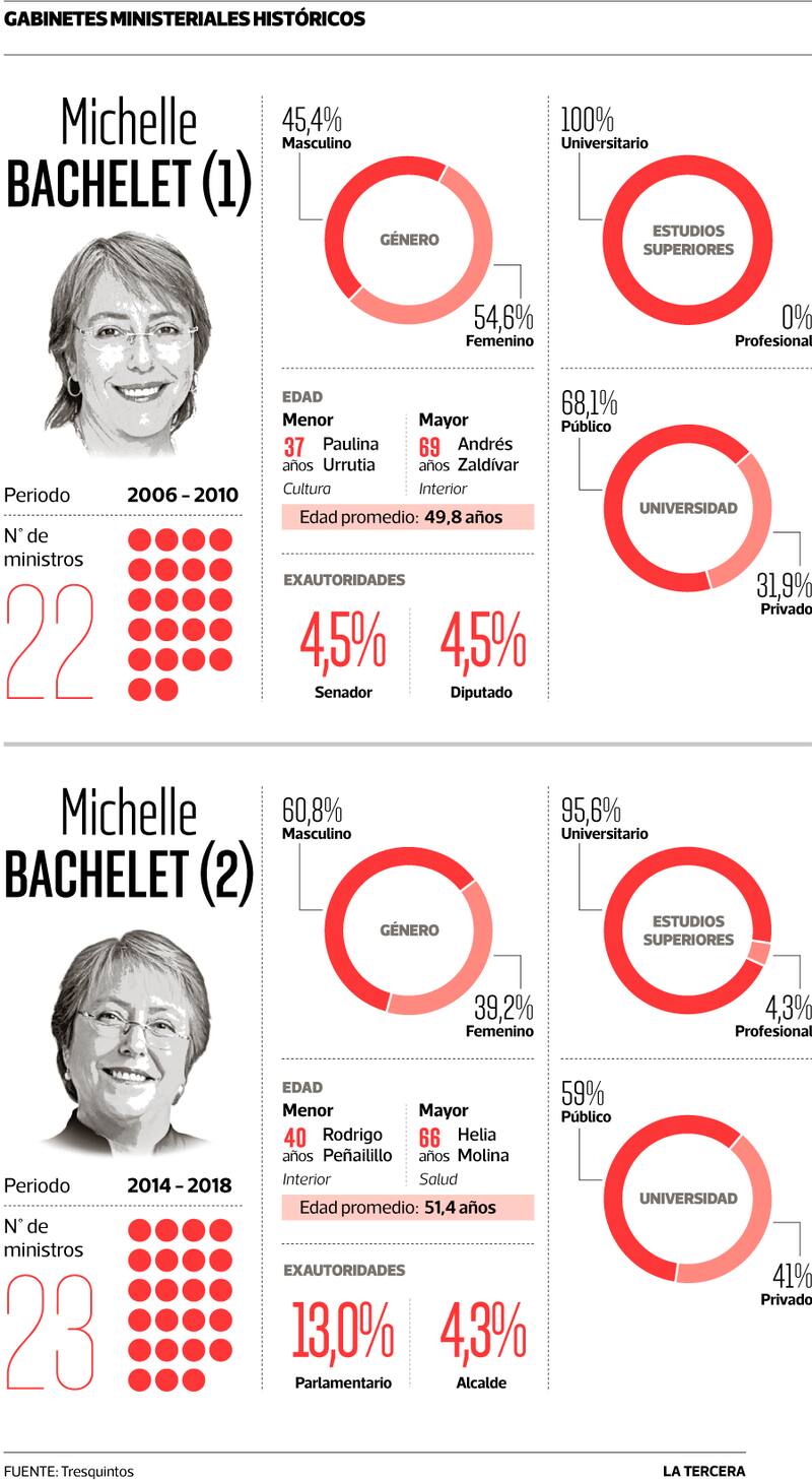 Mientras en el primer período de Michelle Bachelet la edad promedio llegó a 49,8 años, durante su segunda administración la edad promedio aumentó a 51,4 años. Una situación similar ocurrió durante el mandato del Presidente Piñera: su primer gabinete tenía una edad promedio de 49,5 años y su segundo período aumentó a 55,4 años.