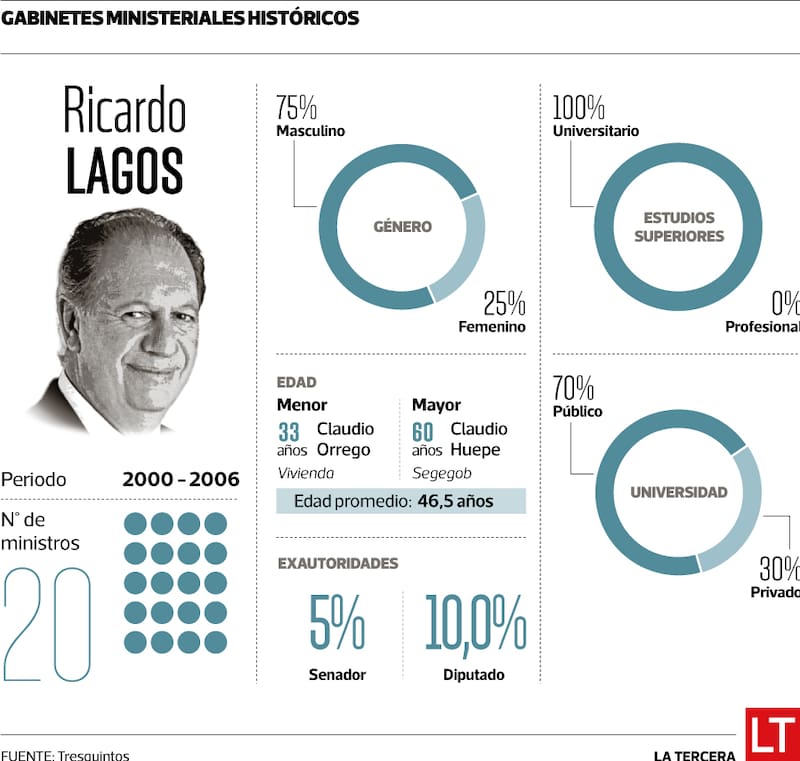 Una situación similar ocurrió en la administración del Presidente Lagos, donde un 70% realizó sus carreras en instituciones públicas, y un 30%, en privadas. La situación en el gobierno de la Presidenta Bachelet, en tanto, se conformó por un 68,1% de ministros con estudios en universidades públicas, y un 31,9%, en privadas. En su segundo período, el porcentaje disminuyó a un 59% de ministros con estudios en universidades públicas, y 41%, en privadas.