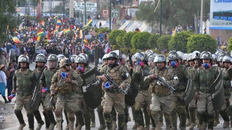 Ante el vacío de poder debido a las múltiples renuncias oficialistas, la senadora Jeanine Áñez asumió un mandato interino respaldada por el Ejército y la oposición, y entre sus primeras órdenes desplegó a las FF.AA. en el país. Para el 15 de noviembre los choques entre policías y manifestantes resultaron en la “masacre de Sacaba”, donde más de 10 personas fallecieron y 120 resultaron heridas. Días después ocurrió un enfrentamiento en Senkata, que dejó una decena de muertos y casi 100 heridos. La CIDH señala que desde el estallido de las movilizaciones y hasta el 6 de diciembre hubo al menos 35 decesos de civiles y más de 800 heridos.