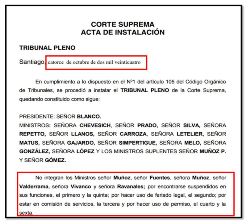 Esa tesis se vería reforzada, insisten, por los propios documentos emanados por la Suprema los últimos días, donde se hace presente que Vivanco está suspendida y no removida. Así, ejemplifican, se evidencia en la integración del pleno celebrado el lunes 14.