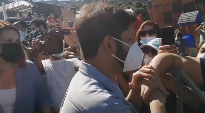Cuando Boric estaba recorriendo la ciudad y saludando a sus adherentes, una mujer avanzó hasta la reja que lo separaba del contacto directo, y le escupió, gritando a favor de la “libertad a los presos por luchar”.