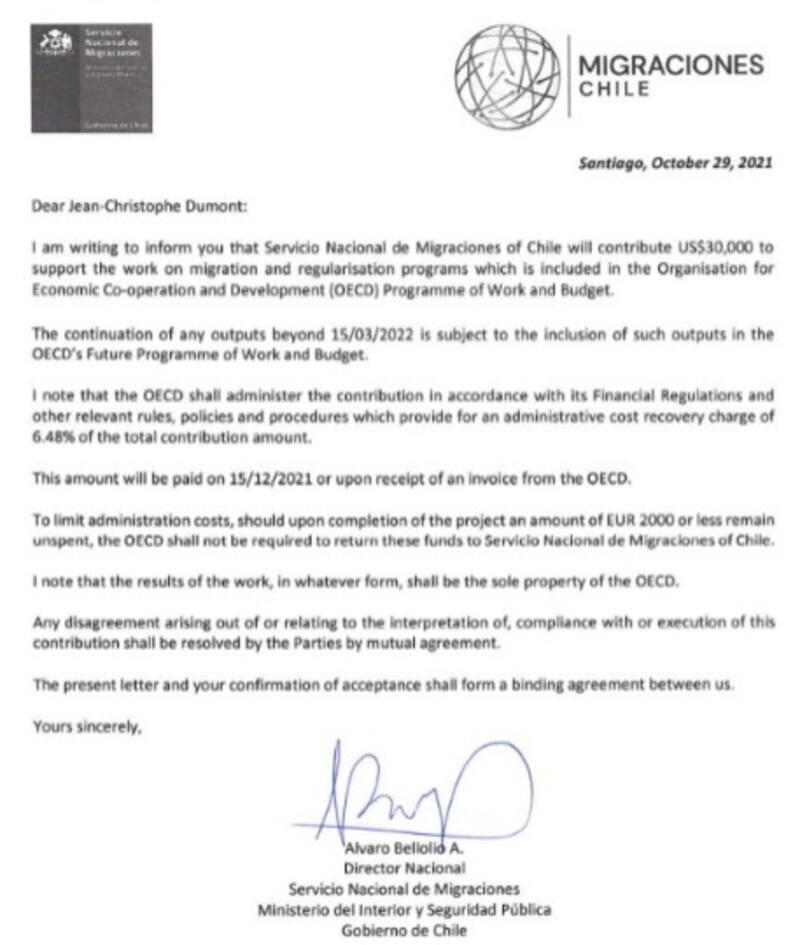 El caso en cuestión se remonta a fines de octubre de 2021, cuando Bellolio envió una carta a Jean-Christophe Dumont, jefe de la División Internacional de Migración de la Ocde, planteándole que el servicio se comprometía a contribuir “con US$ 30.000 para apoyar el trabajo sobre programas de migración y regularización que se incluye en la organización para Programa de Trabajo y Presupuesto de Cooperación y Desarrollo Económicos”.