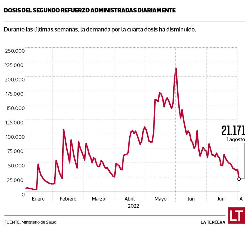 Ernesto Laval, ingeniero y especialista en visualización de datos, explica que “cuando uno ve los datos de cuántas vacunas se aplican semanalmente, efectivamente las últimas cinco semanas han ido disminuyendo. Hubo un alza, la semana del 26 junio al 4 julio, pero desde ahí en adelante hasta comienzos de agosto ha ido disminuyendo progresivamente la cantidad de vacunas que se aplican semanalmente, particularmente la cuarta dosis”.