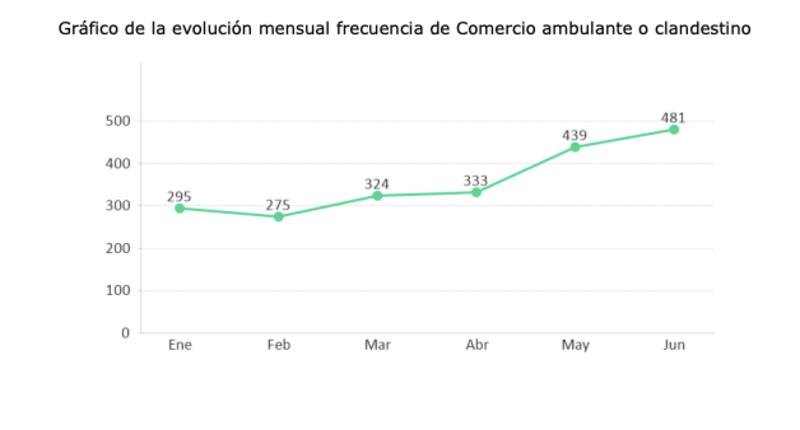 Pero es en el comercio ambulante donde se detectó el problema más urgente. Las cifras dan cuenta de 439 “frecuencia de casos” en mayo, pero 481 en junio, el “peak” más alto en todo el año.