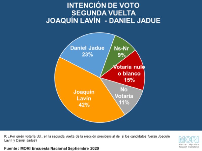 El sondeo de MORI -aplicado a 800 personas- determinaba que en primera vuelta Joaquín Lavín lidera con 17 puntos, seguido de Jadue con 15 puntos. Sin embargo el alcalde PC no lograría sumar los votos de candidatos de centro izquierda en segunda vuelta.