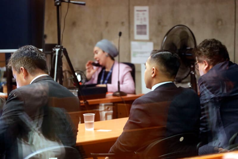 “Él me mira, y hace un gesto de girar hacia la izquierda, en la baranda, agachando su cabeza, poniendo el hombre en mi pecho, eso hace que choquemos; yo me proyecto hacia el norte y él hacia la baranda”, continuó explicando el exfuncionario. Durante varias preguntas a lo largo de la audiencia, el fiscal intentó dilucidar la terminología sobre si el manifestante chocó al exfuncionario o fue mutuo.