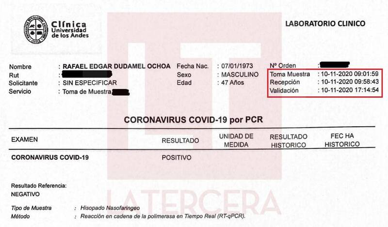 A las 09:01:59 horas, según se refleja en los resultados que tiene la U del nuevo examen PCR que se hizo en la Clínica Universidad de Los Andes, al que tuvo acceso La Tercera PM y que está al final de este texto, Dudamel se tomó la muestra, la que, según el acta, fue recepcionada por el laboratorio clínico a las 09:58:43. En paralelo, Reinaldo Lenis, refuerzo azul y Daniel Azcárate, intermediario de Dudamel que venían en el mismo vuelo, también se habían hecho su PCR.