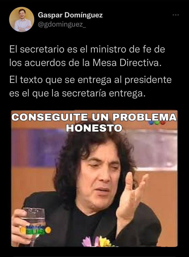 Además, según recuerdan algunos de los asistentes, mencionó que, en caso de aprobarse, el tema podía escalar hasta convertirse en una nueva polémica pública originada desde la mesa. Sepúlveda, por su parte, defendió que esto era una modificación que respondía a las atribuciones de la mesa y que veían dónde se podía armar una polémica.
