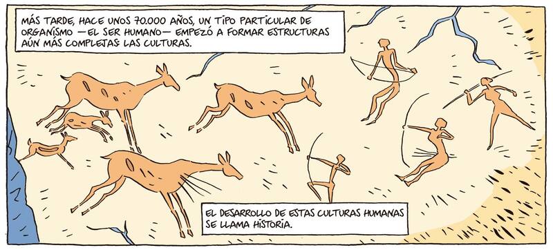 En las primeras páginas se le ve sentado en un sillón. Su figura delgada y calva sostiene un libro entre las manos. “Hola, me llamo Yuval Noah Harari. Soy historiador”, dice. “Sí, ya sé que los historiadores no suelen hablar de física, química y biología. Normalmente hablan de cosas como la Revolución Francesa”, prosigue. “Pero en realidad la historia humana es una prolongación de la física… la química… y la biología”, añade en viñetas donde aparecen Einstein, Marie Curie y Darwin dibujados como niños. “No comprenderemos sucesos como la Revolución Francesa hasta que entendamos cómo evolucionó la humanidad”.