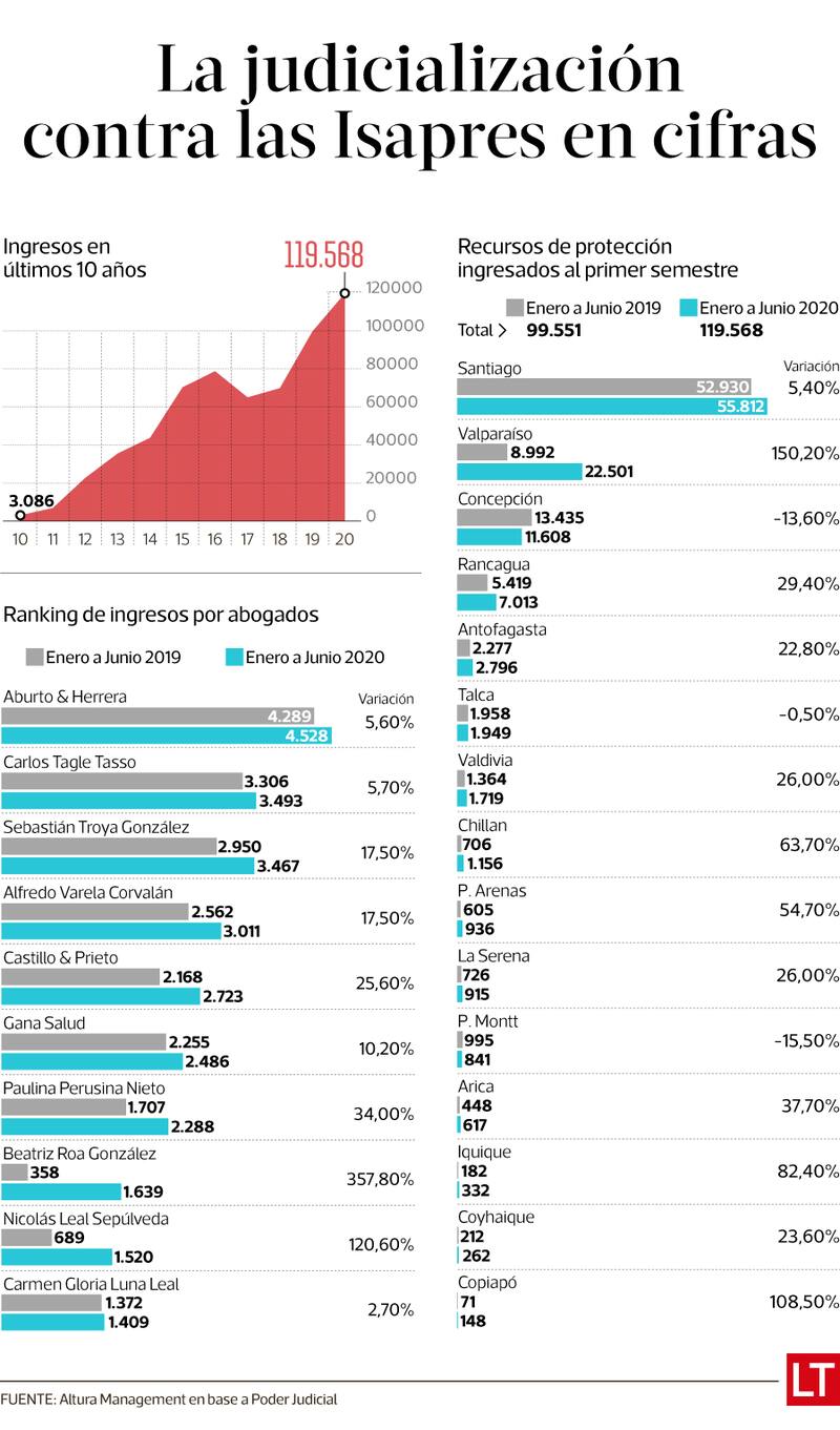 Un estudio de la consultora Altura Management, revela un incremento histórico de la judicialización contra las isapres, motivada por alzas en regiones donde se cobran cuantiosas costas. El informe revela además un ranking de abogados expertos en el tema: el estudio Aburto & Herrera lo lidera, con 4.528 recursos de protección durante el primer semestre de 2020. El presidente de la Asociación de Isapres, Gonzalo Simón, sostuvo que este año se proyecta el pago de costas por U$65 millones, monto equivalente a dar atención de salud por un año a 100 mil personas.