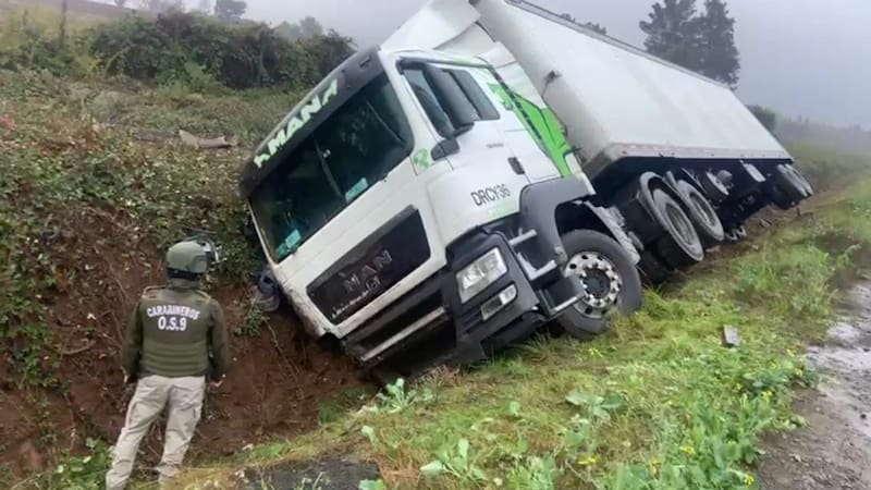 Cuando el conductor se percató de que la camioneta se incendiaba, redujo la velocidad de su camión. En ese momento, comenzó a ser atacado desde un costado de la ruta, lo que provocó el daño en el parabrisas del camión. Entonces perdipo el control de este y cayó a una zanja.