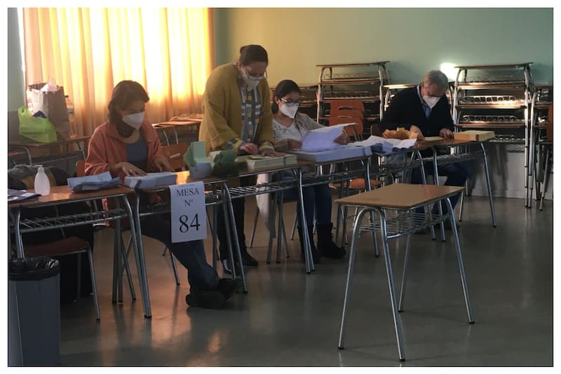La sala de votación se ubica en el segundo piso del colegio. Ahí está acompañado por Isabel Durán, Rosa Sandoval, Florencia Ramírez y Patricia Valdés, presidenta de la mesa. Esta última, muy estricta, solicitó al personal militar restricción a los medios para evitar que los representantes de la prensa complicaran el acceso a los votantes. No obstante, una hora después de construirse la mesa, a las 9, horas llegó el primer votante.