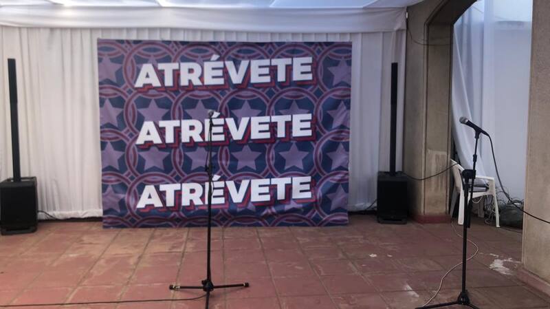 La segunda es el patio grande de atrás, antes el estacionamiento; ahora es una terraza encarpada en con seis mesas grandes enmanteladas de blanco con sillas negras y otras cinco mesas altas con pisos. Hay un carro amarillo que ofrece hamburguesas, muffins, latas de bebida y agua mineral. Al fondo, cuatro amplias pantallas LCD con la señal en vivo de distintos canales TV. Al lado de este espacio, detrás de una arcada, hay otro dispuesto para los puntos de prensa, con la gráfica de “Atrévete” en gran formato de fondo.