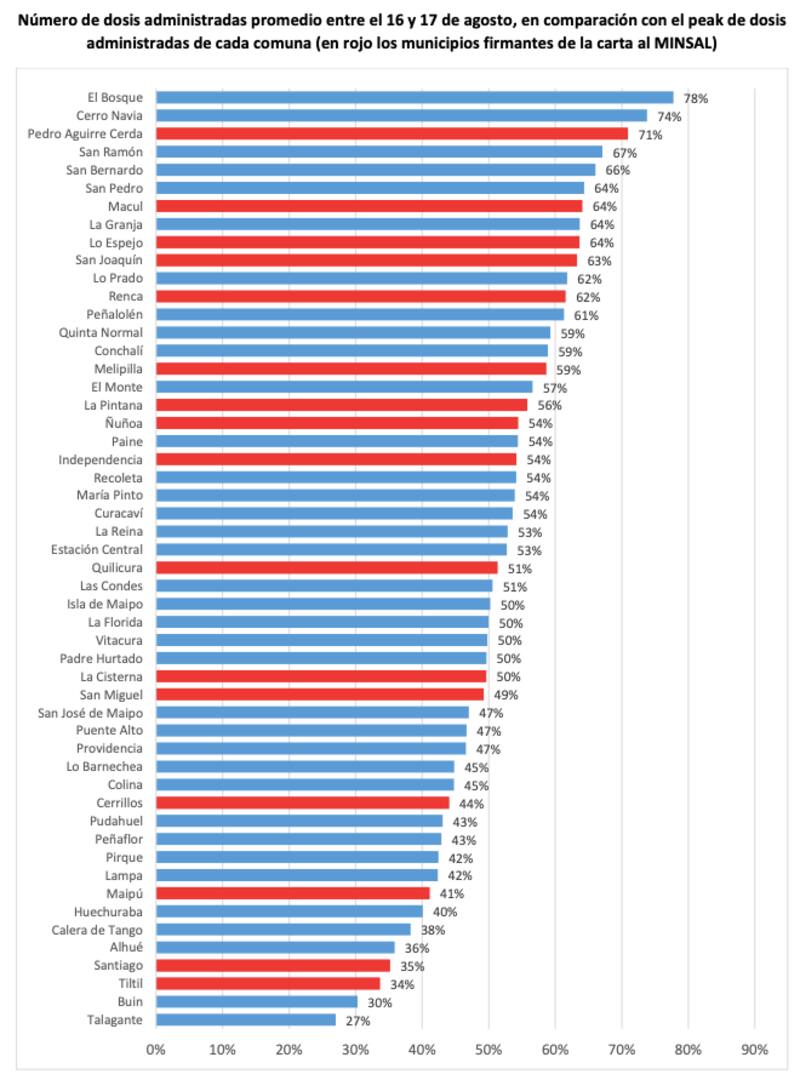 “Entre el lunes 16 y el martes 17 de agosto se superaron las 222 mil dosis administradas promedio (...). Al ver la campaña completa de vacunación, se observa que las 222 mil dosis administradas promedio de los últimos días equivale al promedio de dosis administradas durante el primer semestre”, señala el documento, descartando lo planteado por algunos alcaldes.