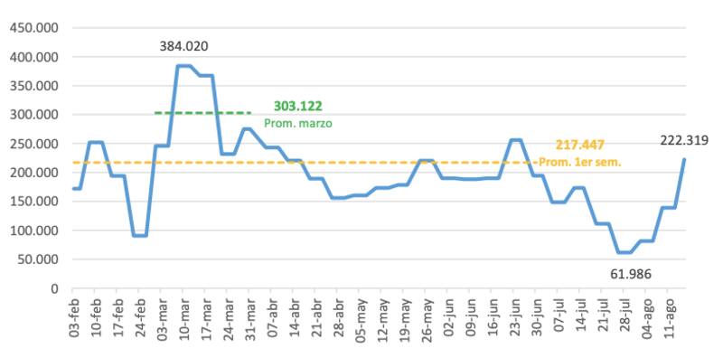 El documento difundido parte señalando que el promedio de dosis diarias inoculadas durante el primer semestre de la campaña de vacunación contra el Covid-19 fue de 217.447 por día. Así, en las últimas semanas, ese ritmo promedio se ha retomado.