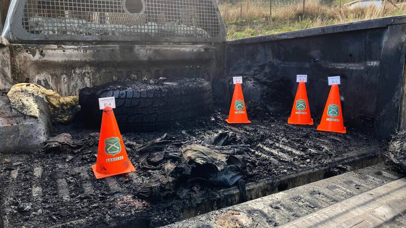 El primer dato que surgió en la investigación fue la camioneta siniestrada, y donde fueron arrojados los carabineros ya fallecidos, antes de prenderles fuego. El vehículo fue encontrado en la peligrosa ruta P-72-S, a la altura del kilómetro 24, específicamente en el sector Antiquina. Fue en ese punto que el vehículo policial AP-2875 fue hallado con cuatro disparos en sus puertas y totalmente quemado.