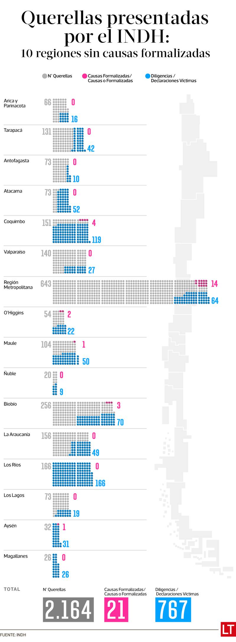 643 de las querellas presentadas por el INDH son de la Región Metropolitana. Según los datos a los que accedió La Tercera PM, solo hay 14 formalizados en esos casos y hasta la fecha del informe se habían tomado 64 declaraciones. En otras regiones, en tanto, hay cero formalizados. (ver infografía)