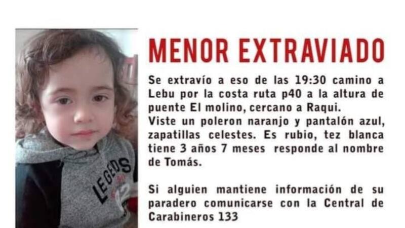 La noche de ayer miércoles se inició un intenso operativo para encontrar al menor de tres años llamado Tomás, a quien a eso de las 20 horas se le perdió el rastro en la localidad de Caripilun, un pueblo agrícola y forestal de no más de 30 casas ubicado a 20 minutos de la comuna de Arauco, en la Región del Biobío.
