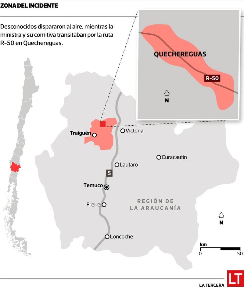 A las 9.50 de la mañana, Siches ya iba rumbo a la reunión en la comunidad Temucuicui. Lo hizo -tal como lo decidió- sin vehículos blindados, ni efectivos de Control de Orden Público (COP), escoltada solo por la subteniente Neira y su equipo de colaboradores. Se trasladaban al interior de una “van”, tipo bus escolar.
