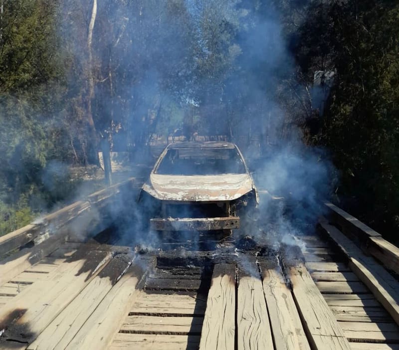 La reivindicación fue firmada por “resistencia mapuche”. Como consecuencia de la quema del auto, se incendió también el puente Tricauco, usualmente utilizado por las personas del lugar como vía para llegar a los colegios del sector.