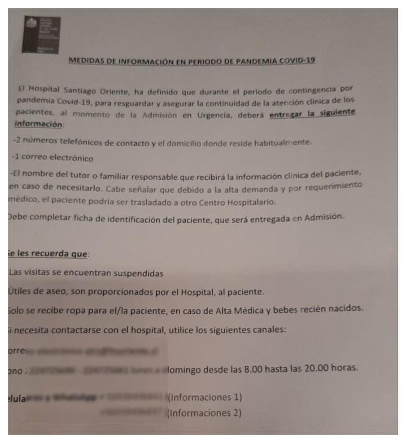 El papel aclara que el paciente puede ser trasladado a otro centro hospitalario y que las visitas están suspendidas y finalmente, da la opción de comunicarse hacia el hospital, entregando un correo electrónico institucional, dos números fijos con horario (de 8.00 a 20.00 horas) y dos celulares con Whatsapp.