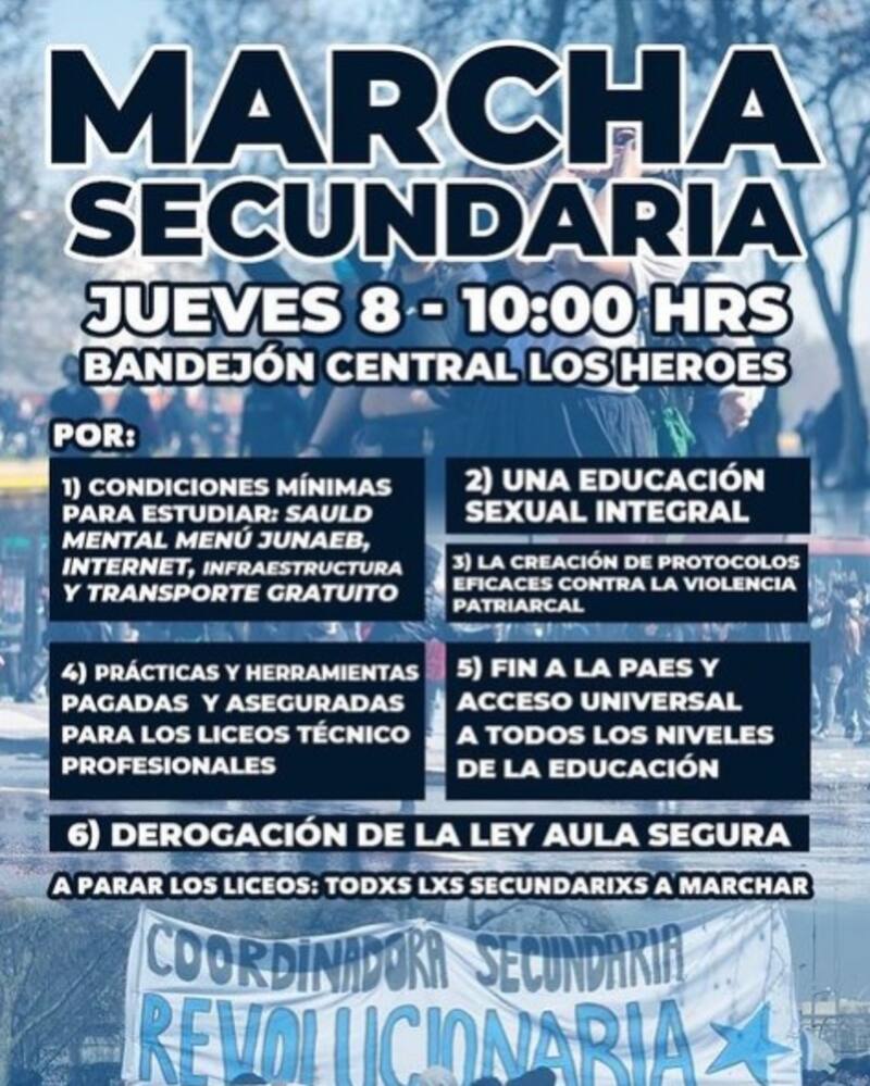 Así, ha surgido también una organización llamada Coordinadora Secundaria Revolucionaria, la que en sus redes sociales ya convocó para el jueves venidero a nuevas movilizaciones: “Ante las actuales condiciones de nuestra educación, llamamos a todos los liceos a luchar por El Petitorio Secundario. Ya no queremos migajas, ni soluciones parche. Por eso este jueves a desbordar las calles en una nueva Jornada de Protesta Secundaria”.