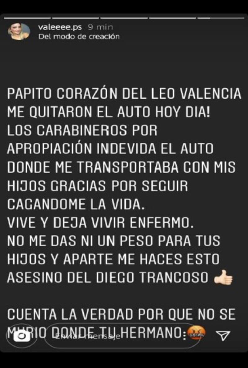Dentro de las publicaciones que hizo la madre de los tres hijos del volante, se encuentra una que realizó hace algunas semanas, por las que tomó acciones legales y presentó el 28 de julio pasado una querella por calumnias con publicidad en el mismo Juzgado de Garantía de San Bernardo. Se trata de una de historia de Instagram, en la que la mujer lo acusa de ser responsable de la muerte de su cuñado. “No me das ni un peso para tus hijos y aparte me haces eso, asesino del Diego Troncoso. Cuenta la verdad por que (sic) no se murió donde tu hermano”, escribió.