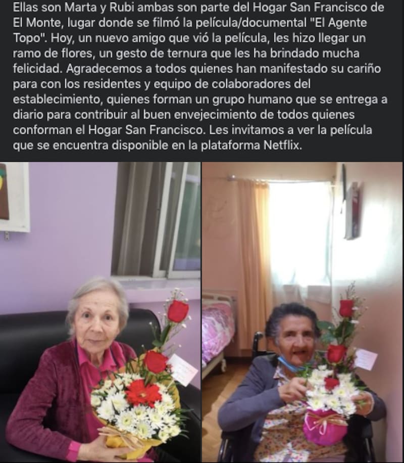 Por otro lado, de las adultos mayores que protagonizan el filme, Rubira Olivares y Marta Olivares (sin parentesco), las amigas de Don Sergio en el Hogar San Francisco del Monte, volvieron a las redes sociales en febrero pasado, puesto que recibieron sendos ramos de flores de parte de “un amigo que vio la película”.