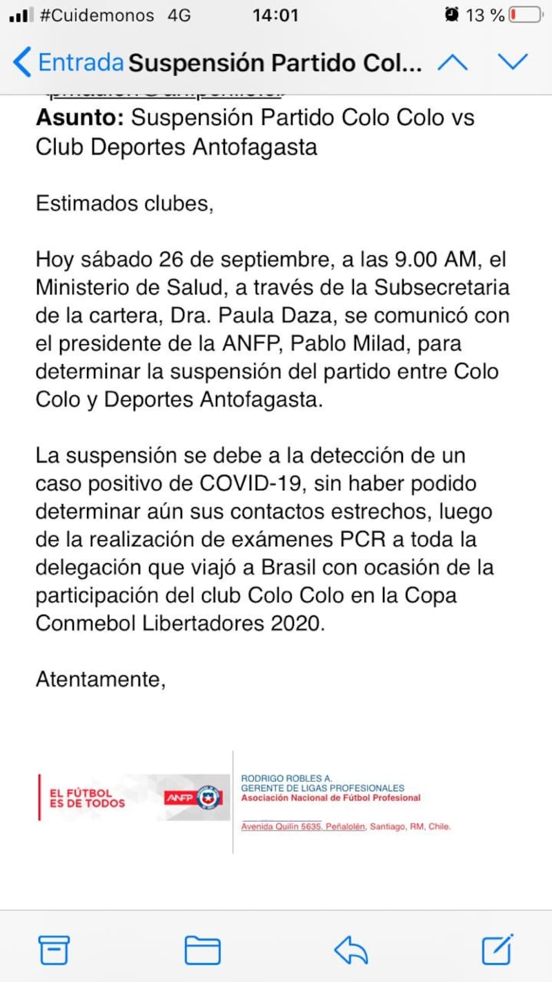 El correo contenía la misma información que minutos más tarde el ente del fútbol nacional hizo pública, en la que apuntaban a la subsecretaria de Salud Paula Daza como responsable de la decisión: “Hoy sábado 26 de septiembre, a las 9:00 am, el Ministerio de Salud, a través de la Subsecretaria de la cartera, Paula Daza, se comunicó con el presidente de la ANFP, Pablo Milad, para determinar la suspensión del partido entre Colo Colo y Deportes Antofagasta”, publicó la ANFP, argumentando que “la suspensión se debe a la detección de un caso positivo de COVID-19, sin haber podido determinar aún sus contactos estrechos, luego de la realización de exámenes PCR a toda la delegación que viajó a Brasil”.