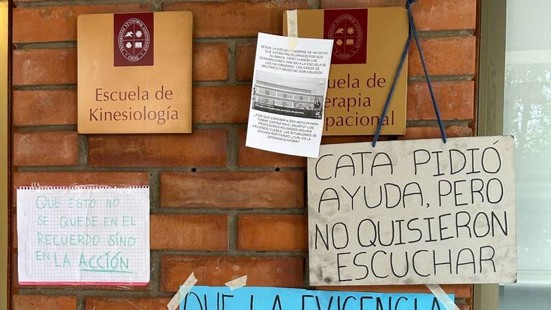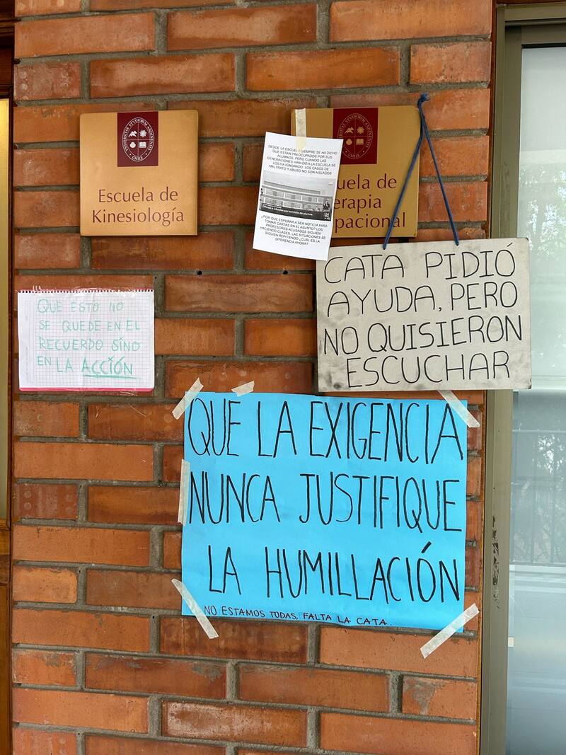 La jornada de jueves, así como las previas -especialmente el 5 de abril, Día del Terapeuta Ocupacional-, ya había estado marcada por las decenas de carteles y papeles en alusión a Catalina Cayazaya que se logran apreciar por los pasillos y patios de la casa de estudios, con mayor fuerza en los alrededores de la Escuela de Terapia Ocupacional.