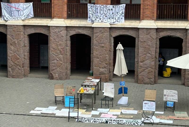 “Cata pidió ayuda, pero no quisieron escuchar”, se lee en uno de ellos, mientras que en otro se ve “Nunca más con miedo a prácticas”. En un tercero, en tanto, dice “Nosotrxs cuidamos vidas, ¿quién nos cuida a nosotrxs?”.
