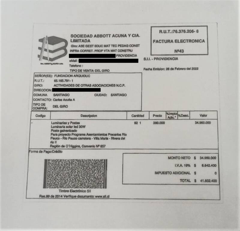Pero lo más grave, a juicio del Serviu, era que Arquiduc había comprado los materiales a una empresa que era propiedad de su mismo director, Carlos Acuña. Así quedó en evidencia en la factura electrónica N°43 emitida el 28 de febrero de 2022, a días del cambio de gobierno, por “Sociedad Abbott Acuña y Compañía Limitada”. En ella le vende a la fundación Arquiduc 92 luminarias solares y 92 “postes galvanizados”, y no de fierro, por un total de $41 millones.