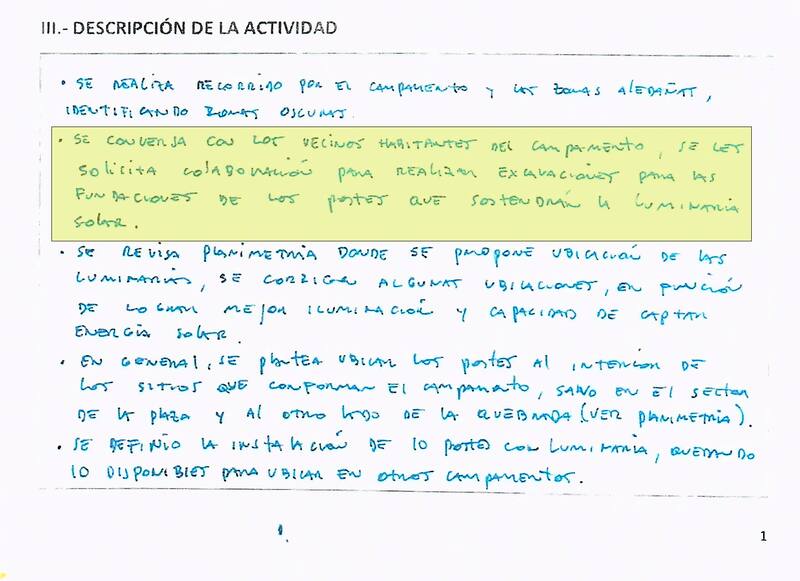 Una prueba de ello quedó en una de las rendiciones que la fundación presentó al Serviu, a las que La Tercera tuvo acceso. En el documento que da cuenta de las actividades ejecutadas en noviembre de 2021, en al menos tres casos quedó registrado que “se conversa con algunos integrantes del campamento indicándoles que se les solicitará colaboración para la realización de excavaciones”.